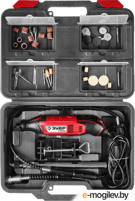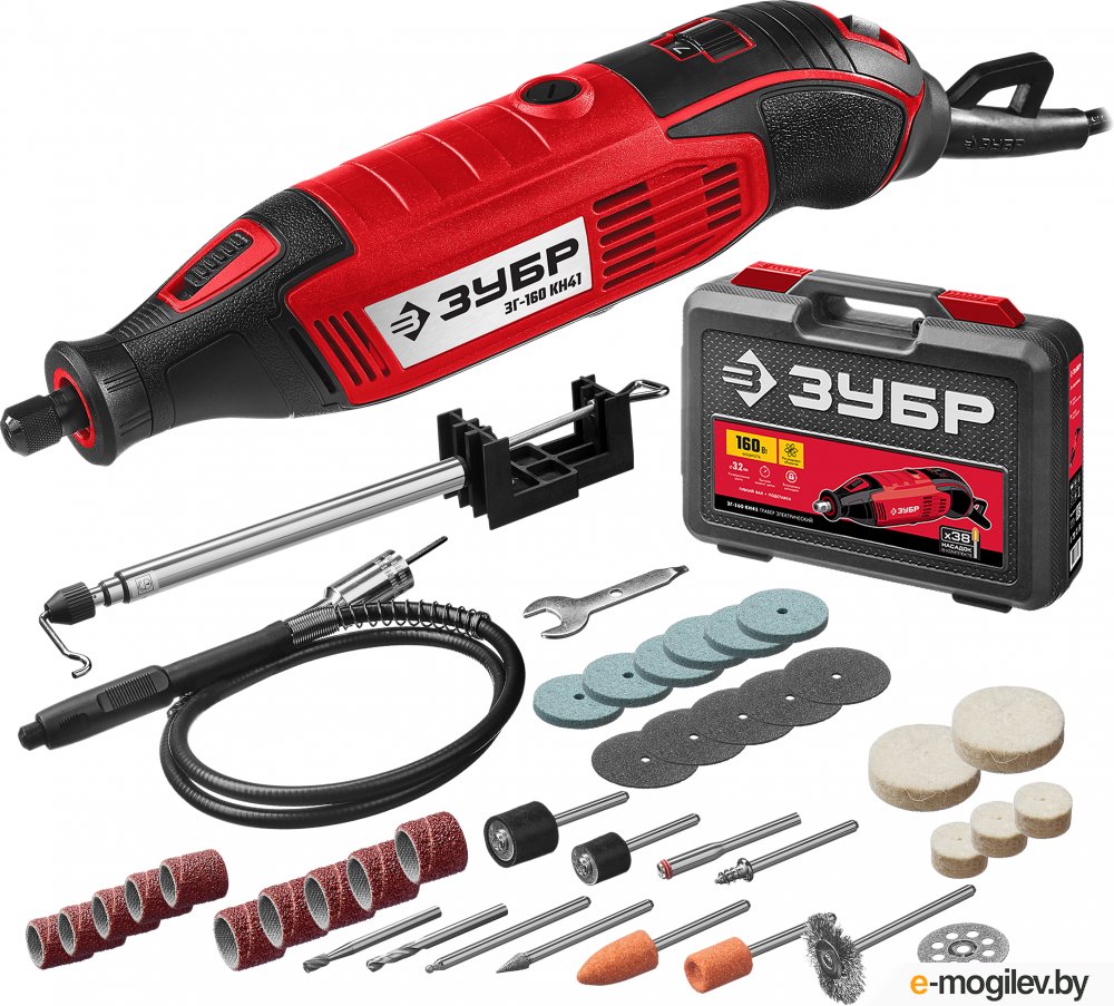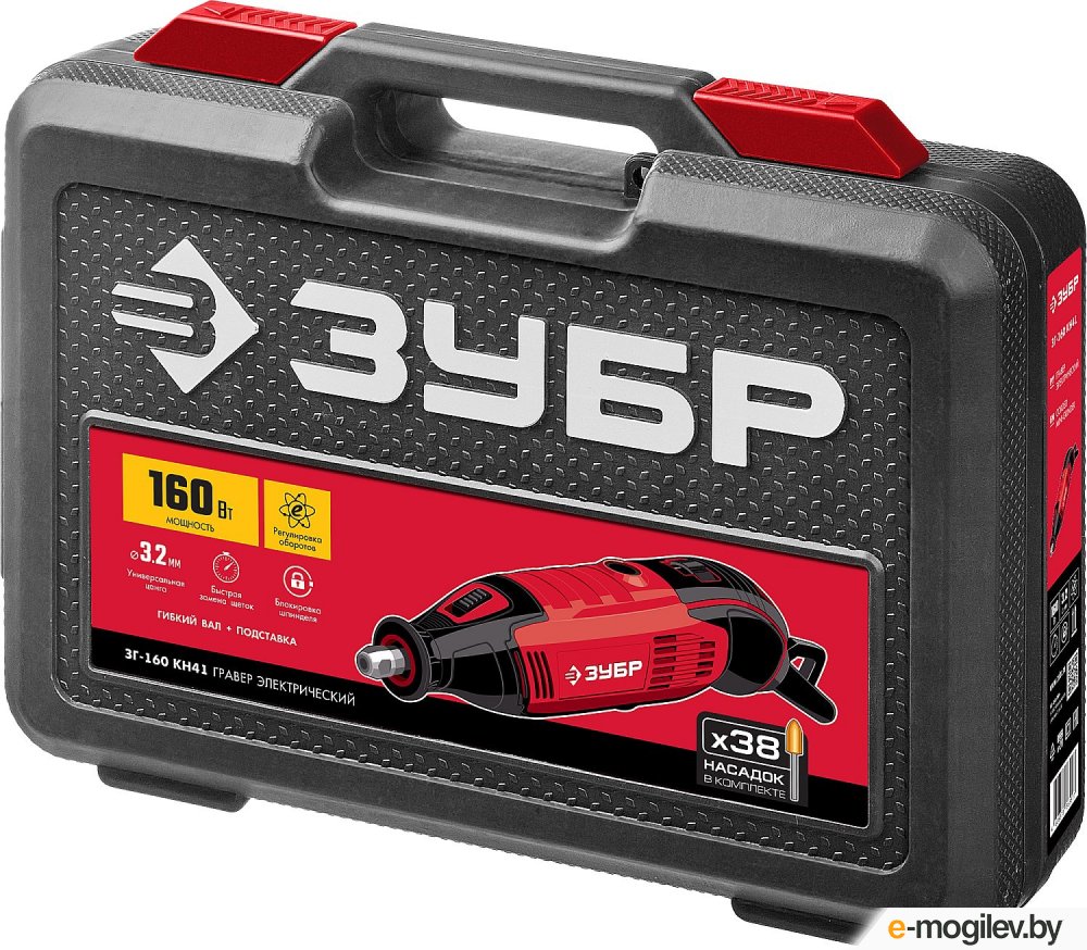 → Гравер электрический, ЗУБР ЗГ-160 КН41, 220В, 160 Вт, 3.2 мм, 15000-35000 об/мин, набор насадок, цанг и державок, гибкий вал, штатив, 41 предмет, кейс