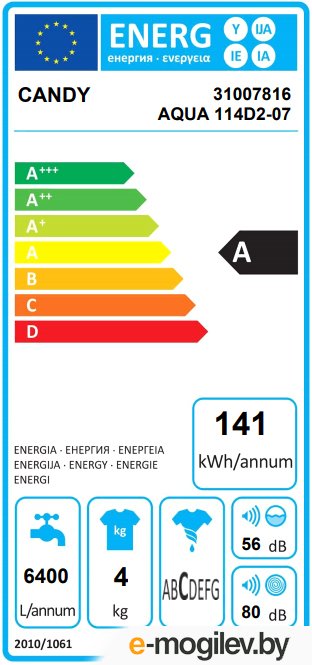 Расход электроэнергии за цикл: 0.76 кВт*чГодовой расход воды: 6 400 лИнверторная технология: Годовой расход электроэнергии: 141 кВт·ч/годКласс стирки: A