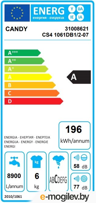 Класс стирки: AГодовой расход воды: 8 900 лГодовой расход электроэнергии: 196 кВт·ч/год