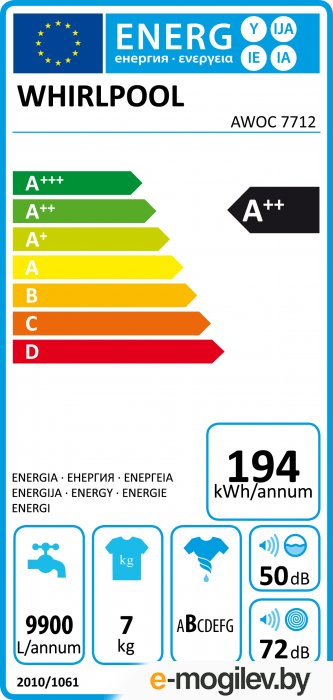 Годовой расход воды: 9 900 лГодовой расход электроэнергии: 194 кВт·ч/годКласс стирки: AРасход электроэнергии за цикл: 0.91 кВт*чРасход воды за цикл: 52 л